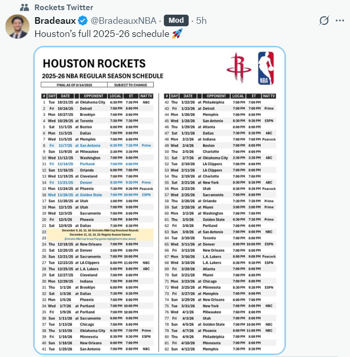 凯文-杜兰特的加盟让这支火箭队有了揭幕战、年终大战的排场,除此之外火箭队还有28场全美直播排在联盟第二多(与森林狼并列),仅次于勇士、雷霆、湖人、尼克斯34场全美直播,休媒详细解读了火箭队这波赛程。