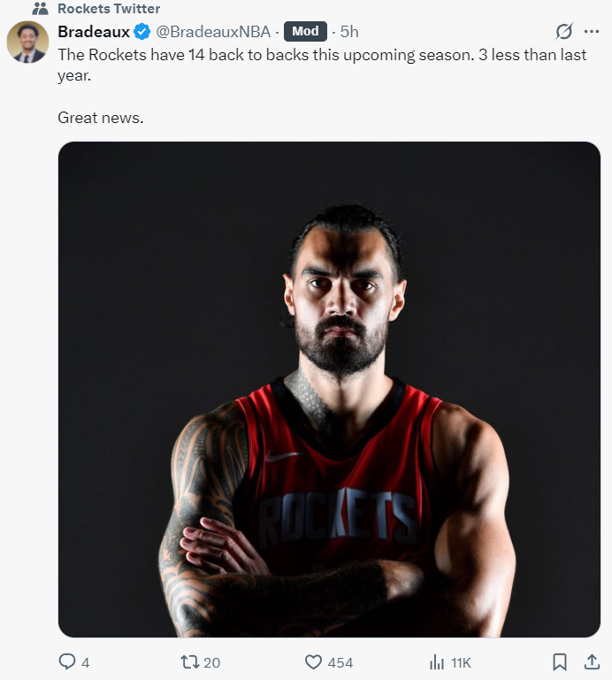 休媒Bradeaux写道:25-26赛季火箭队只有14场背靠背比去年少了3场,其中还有8次无需转场(也就是背靠背第二天还是在当地打,这就缓解了疲劳的状态,降低受伤风险)